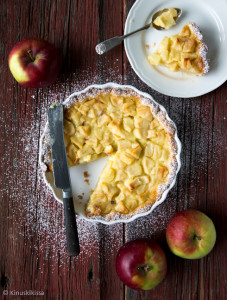Puhalsin jälleen pölyt vuodelta 1899 peräisin olevan Suomen Kuvallisen Keittokirjan päältä tarkoituksenani löytää sopiva vanhan ajan leivonnainen viikon piristykseksi. Tämä oli jatkumoa wanhojen leivonnaisten sarjalle, joka alkoi kesällä nimipäivärinkilästä. Selasin hakemistoa omenan kohdalle, sillä mieleni teki kokeilla omenapiirakkaa. Päädyin yhdistelemään hieman eri ohjeita ja säveltämäänkin jouduin hiukan (täysin kirjaimellisesti tehtynä piirakkaan olisi kulunut yhteensä 7 keltuaista!), mutta olennaiselta osin sain mielestäni oikean hengen säilytettyä. Miellyttävän mehevä ja vienolla mausteisuudellaan lumoava piirakka!